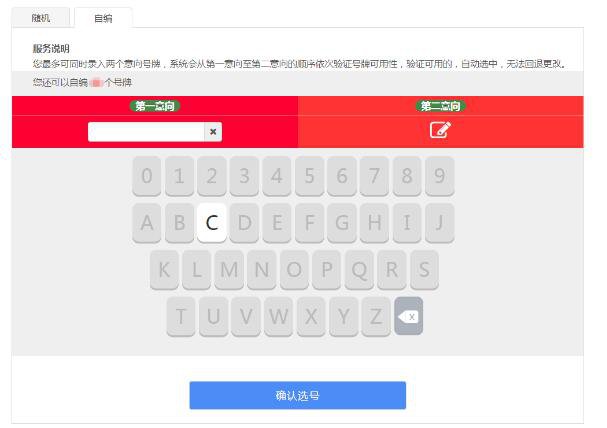 用户对多次随机的号牌号码不满意,并且还拥有自编选号机会,可点击“自编”Tab页跳转到自编选号操作页面。