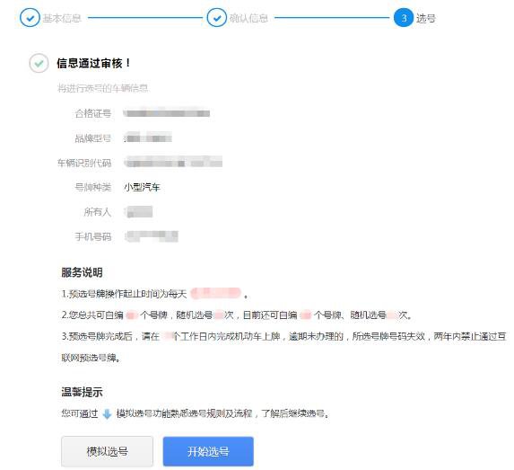 如果自编号牌验证通过,系统将自动确认号牌,用户即完成预选号,进入第二阶段步骤3【完成号牌预选】。