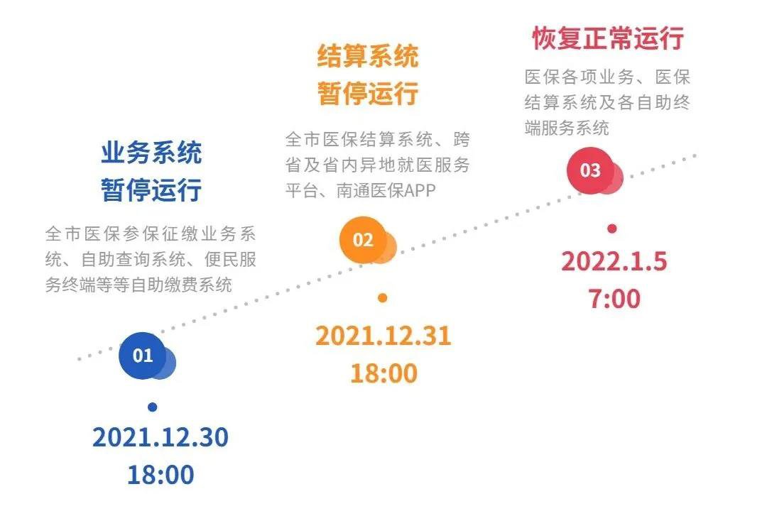 2、2021年12月31日18时起,全市医保结算系统、跨省及省内异地就医服务平台、南通医保APP暂停运行。