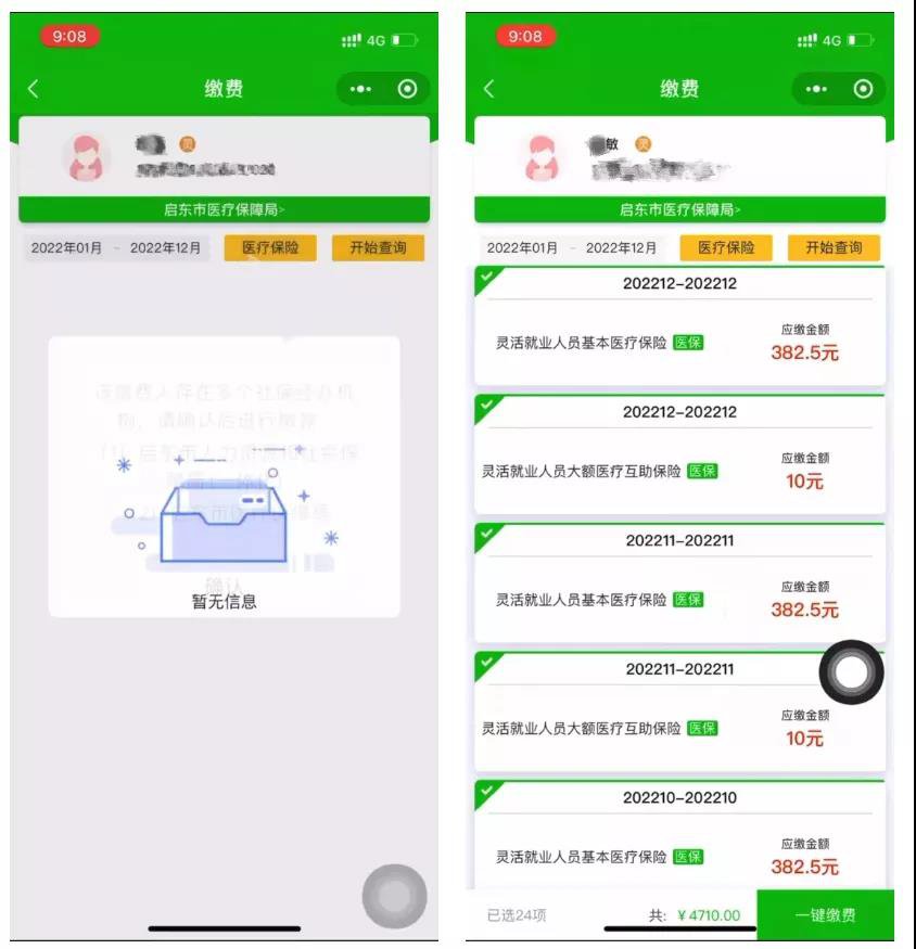 2、选择“启东市医疗保障局”的经办机构(医疗保险)以后,点击“缴费” 后再点击“开始查询”,会跳出2022全年的未缴费记录,点击未缴费记录左上角的√,点亮以后,点击“一键缴费”,即可缴费。