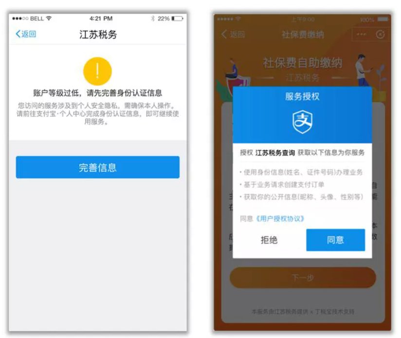 点击社保缴费“下一步”需要确定同意实名认证协议。若首次登入,需同意服务授权;已实名认证,则直接进入“社保费缴纳”页面。