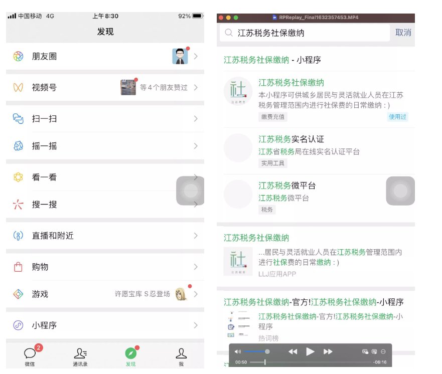 方法二:在微信中,点击发现 -> 小程序 -> 放大镜搜索 -> 输入“江苏税务社保缴纳”进行搜索,点击进入。