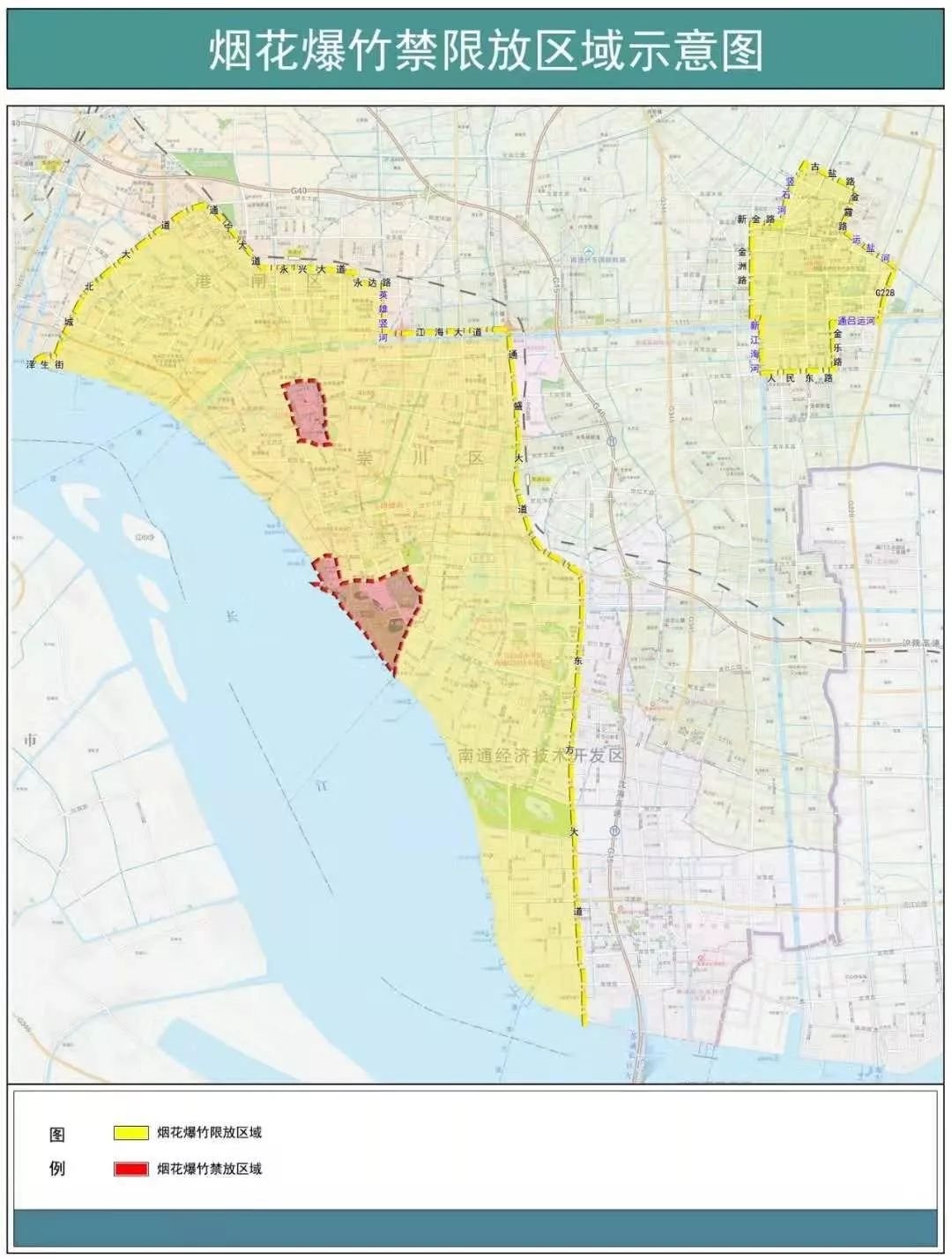 市政府同时发布《关于明确市区烟花爆竹限制燃放区域的通告》,划定港闸区城北大道、通宁大道、永兴大道以南,崇川区通盛大道以西,开发区东方大道以西地区,以及金沙镇主城区为烟花爆竹限放区域。