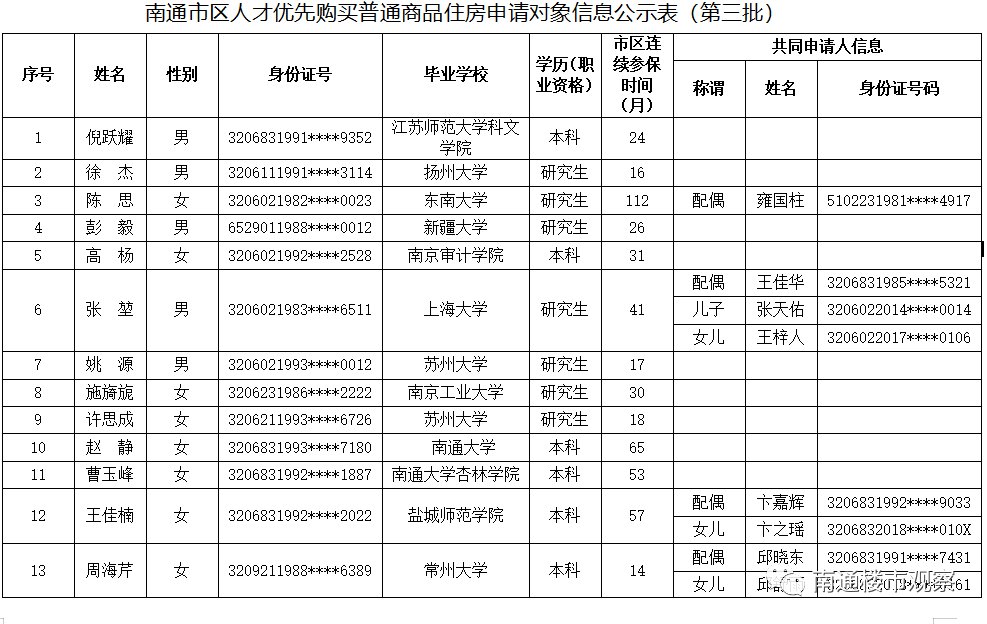 2020年南通市第三批人才优先购房申请对象公示