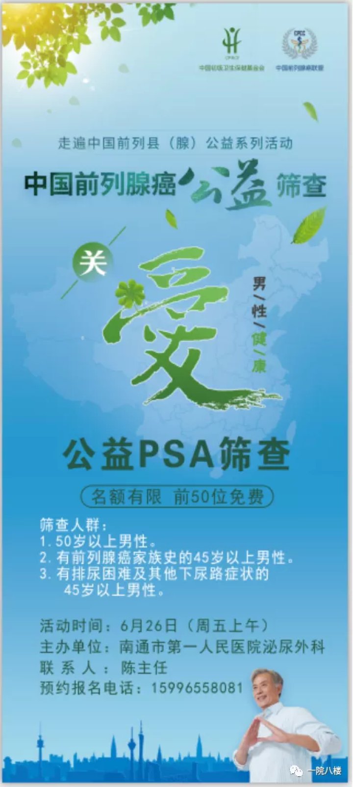 6月26日,南通市第一人民医院泌尿外科将举办“关爱男性健康——前列腺癌公益筛查活动”。此次活动的免费筛查对象为:50岁以上男性;有前列腺癌家族史的45岁以上男性;有排尿困难及其他下尿路症状的45岁以上男性。
