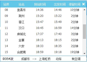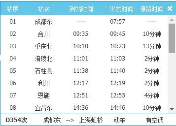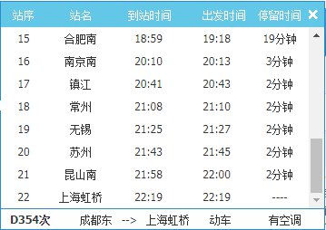 在12306网站查询发现,D354次动车的始发站为成都东,终点站是上海虹桥;其中途经湖北潜江、汉口以及江苏南京、镇江、常州、苏州、昆山 等城市。出发时间是早上7:57,到达时间为晚上22:19。