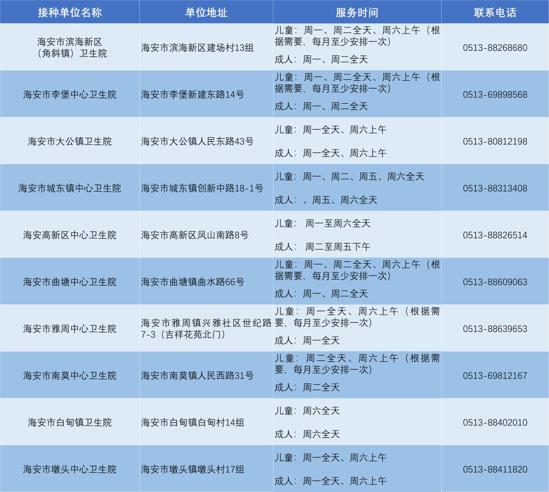 海安市10家儿童预防接种单位,均兼设成人预防接种单位。