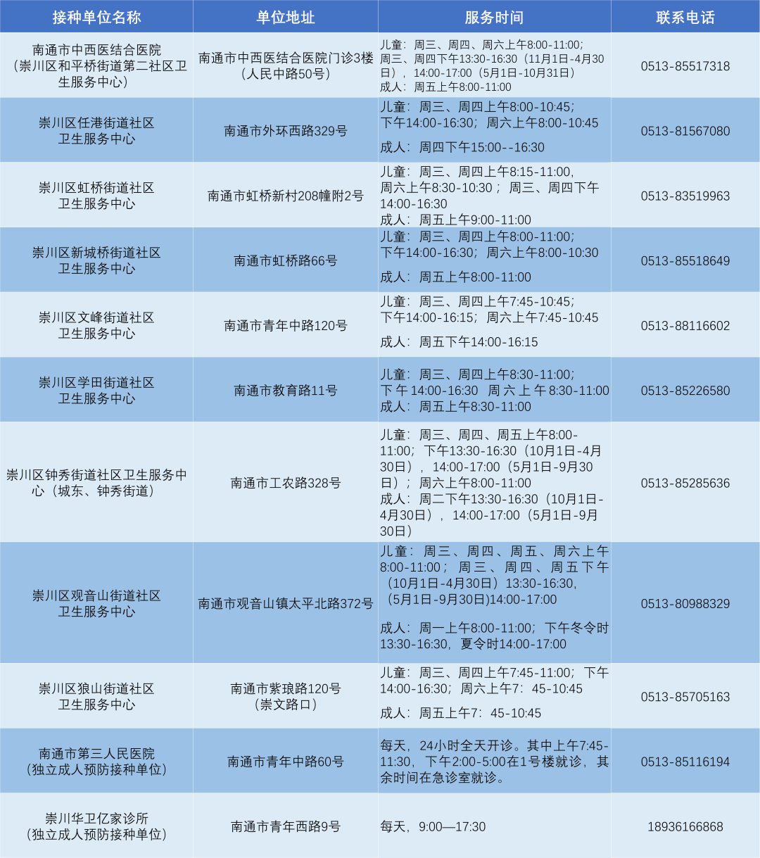 崇川区9家儿童预防接种单位,均兼设成人预防接种单位。另设2家独立成人预防接种单位。