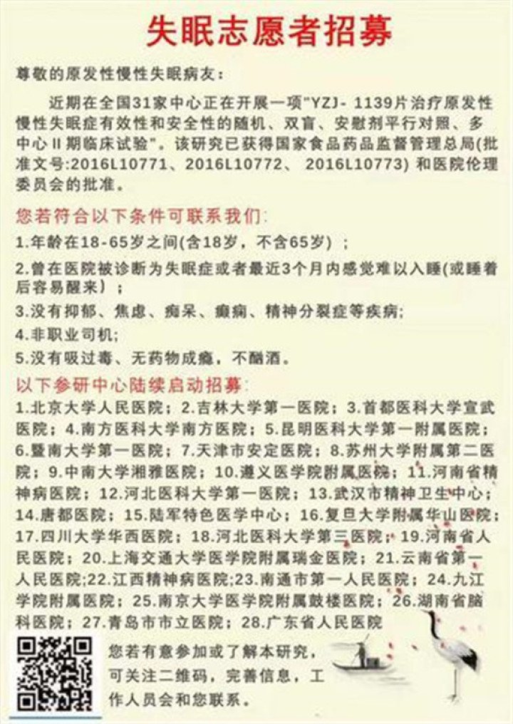 南通市一院公开招募失眠志愿者