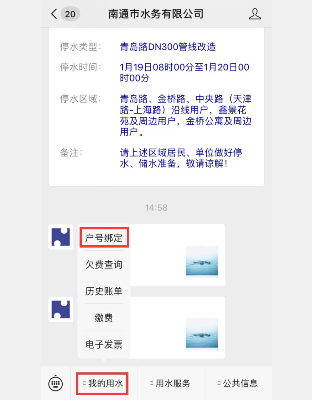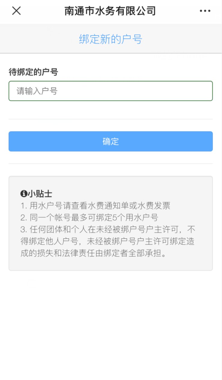 3、登录南通市水务有限公司微信公众号,点击“我的用水”,绑定总户号后查询。