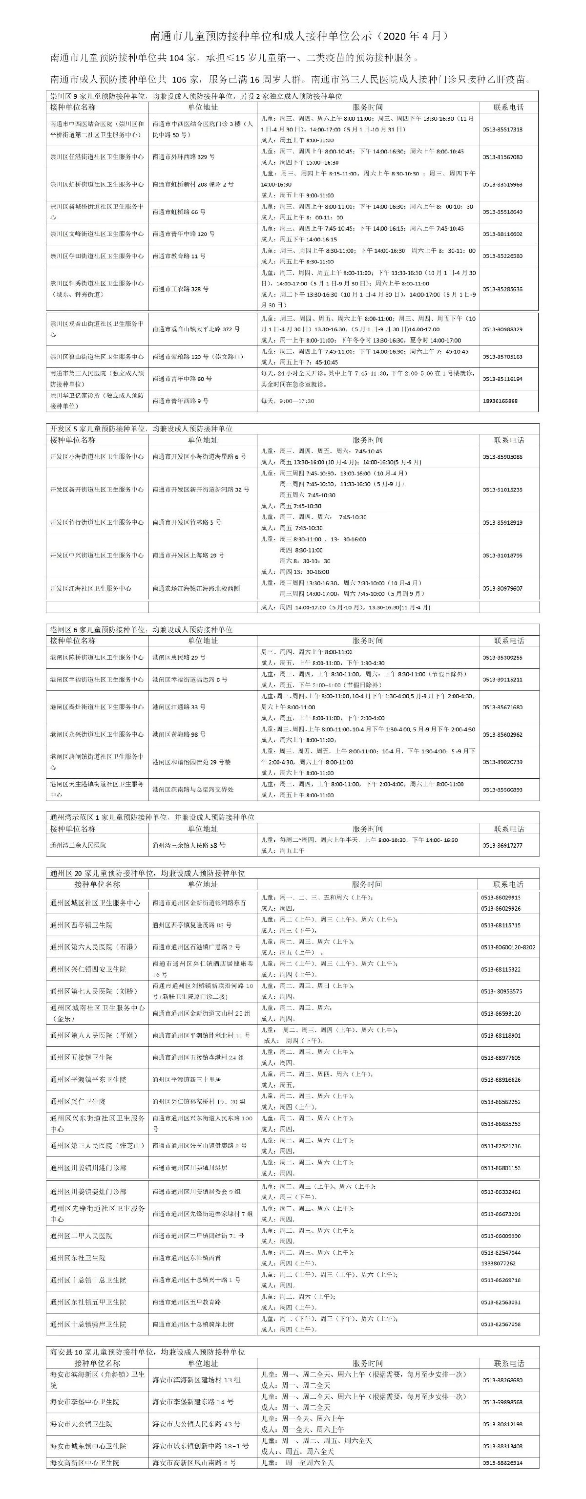 南通市儿童预防接种单位和成人接种单位公示(4月)