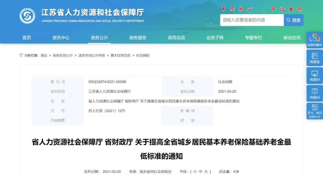 2021年2月20日,江苏省人社厅、省财政厅发布通知,从2021年1月1日起,江苏省城乡居民基本养老保险,省定基础养老金最低标准从每人每月160元提高至173元。
