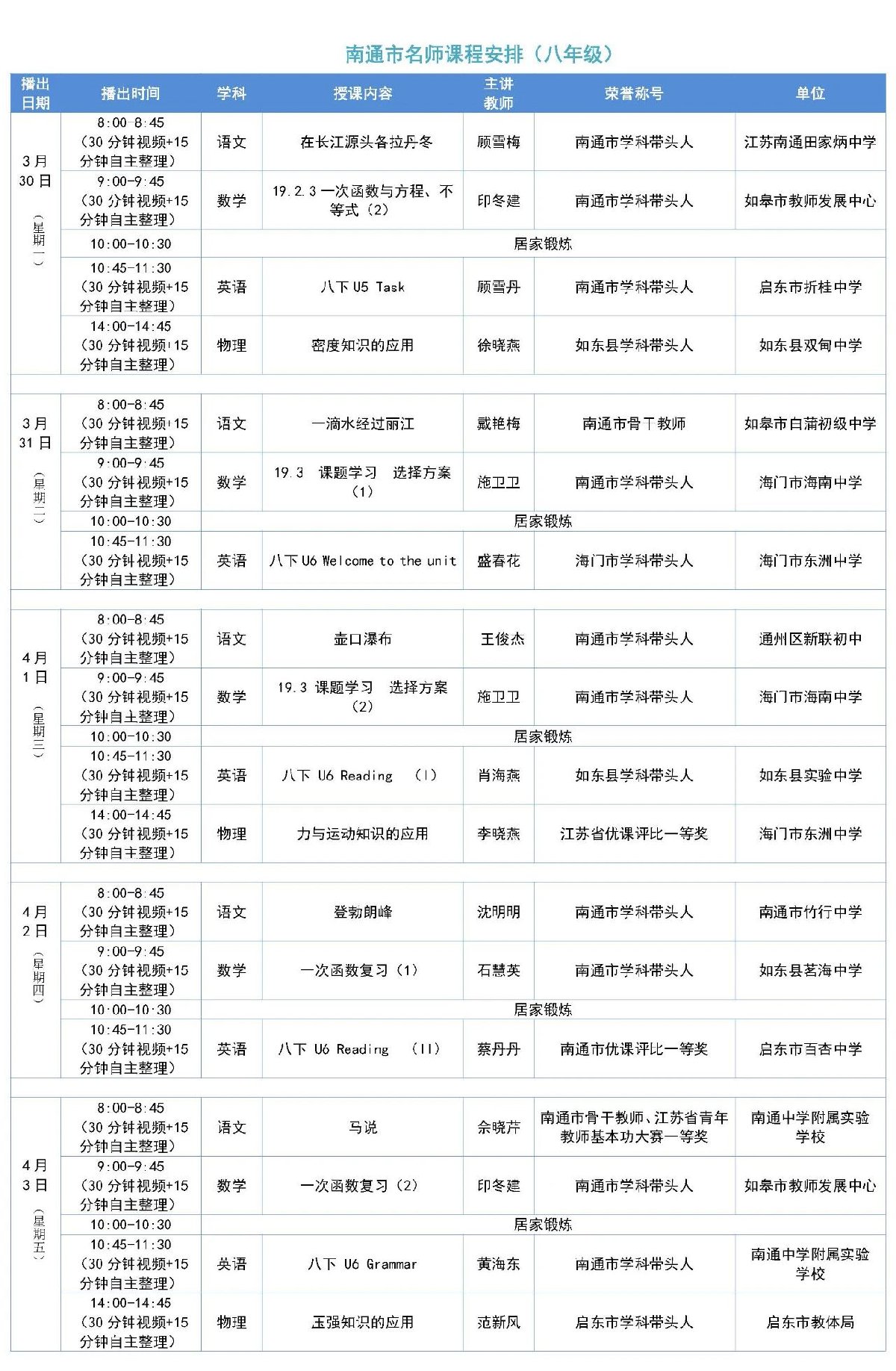 南通名师线上课堂八年级第八期课程表一览