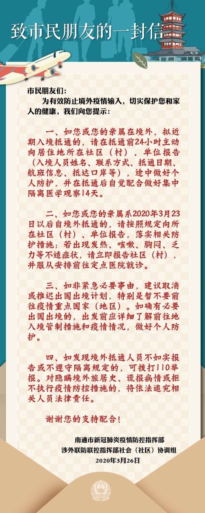 为有效防止境外疫情输入,切实保护人民群众生命安全和身体健康,3月26日,南通市新冠肺炎疫情防控指挥部涉外联防联控指挥部社会(社区)协调组发出提示,对入境返通及计划出国人员提出相关建议。