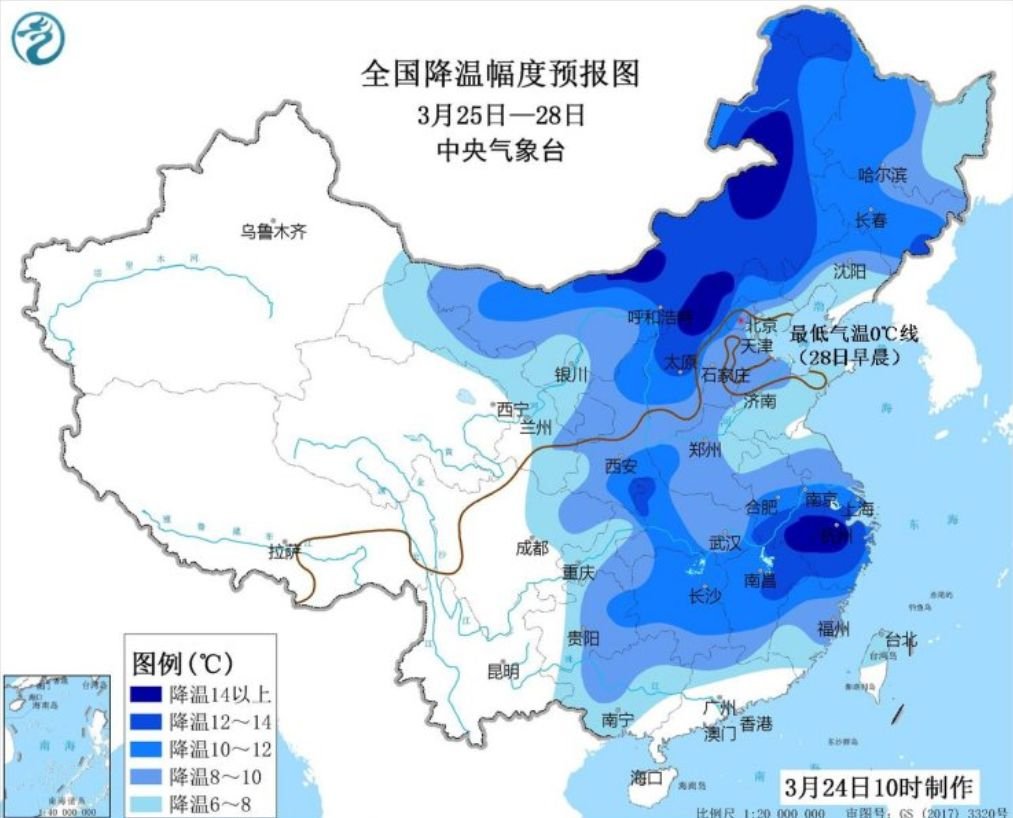 26日夜里到28日受强冷空气影响,将有大风降温过程,最低气温降幅8~10℃,并伴有陆上和沿江江面6~8级、沿海海面7~8级阵风9~10级的偏北大风。29日最低气温4℃左右,局部有霜冻。