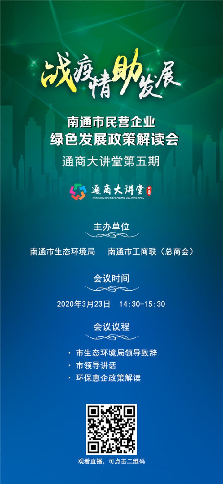 市生态环境局和市工商联将联合主办“抗疫情 助发展”南通市民营企业绿色发展政策解读会(通商大讲堂第五期),以线上宣讲的形式,为广大企业解读相关环保政策,提供环保技术支持,切实提高服务民营企业环保绿色发展的能力和水平。