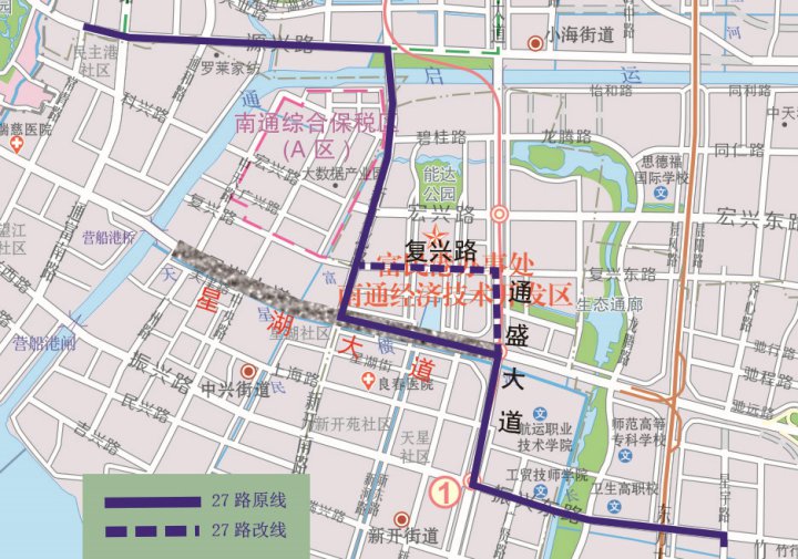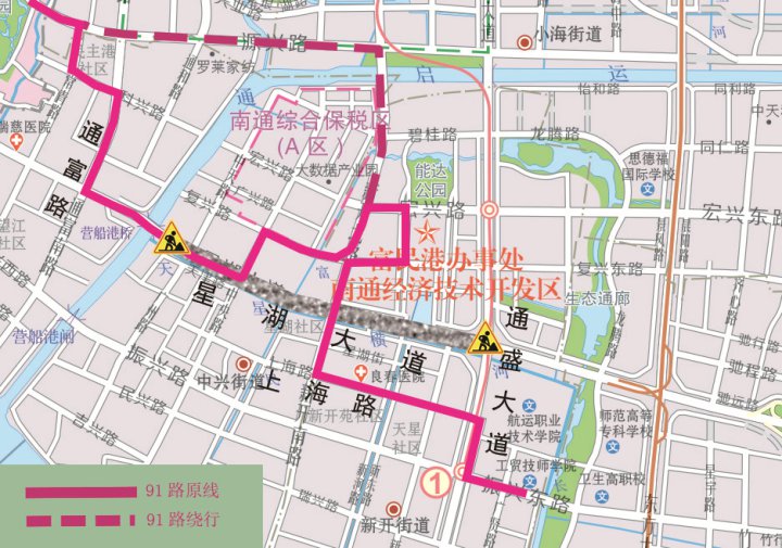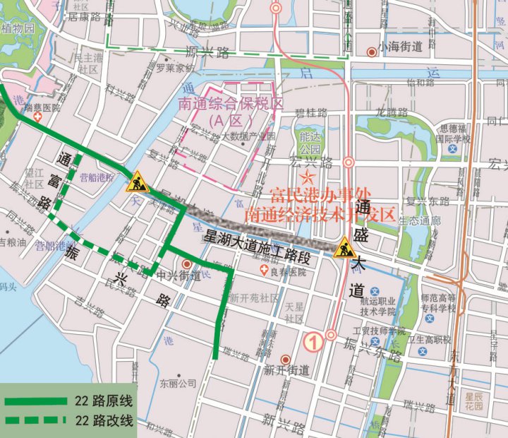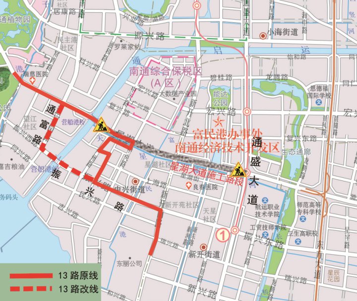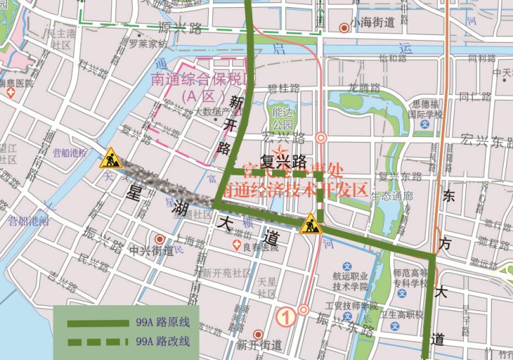 起终点不变;原线行驶至星湖大道通富路口时,向南沿通富路—振兴路—原线,暂不停靠星湖大道“开发区公安分局、交警五大队东、安惠公司”、广州路“欧爱克斯公司”、通州路“通州路上海路口、开发区国土局”站点;临时新增停靠“通富路星湖大道南、通富路振兴路口”、“振兴路连云路口”站点。