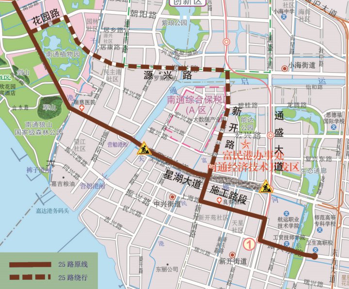 起终点不变;原线行驶至工农路花园路口时,向沿东花园路—园林路—源兴路—新开路—原线,暂不停靠工农路“狼山客运站”、星湖大道“瑞慈医院、安惠公司、星湖花园南”;临时新增停靠花园路“五山公寓、五山家苑”、源兴路“星宇花园”、新开路“新开北路宏兴路口、华润橡树湾”站点。