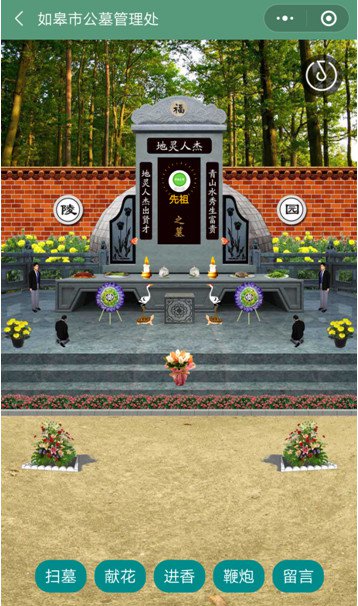 通过墓地场景底部的扫墓、献花、进香、鞭炮、留言等按钮完成虚拟祭扫互动体验。