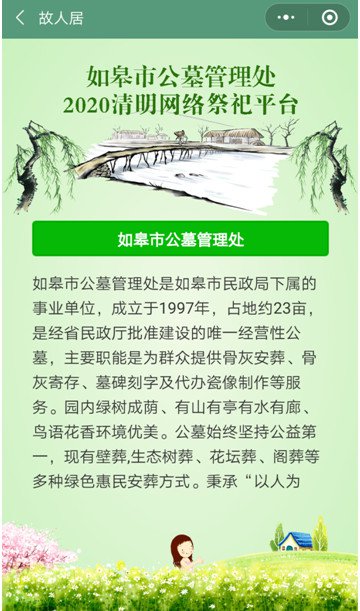 市民政局通知今年清明节期间,广大市民可通过如皋市公墓管理处2020年清明网络祭祀平台,采用网络祭祀的现代方式来表达对先人的追思。如皋市广大市民朋友要弘扬尊老敬老的传统美德,树立厚养礼葬的新观念,不在居民小区绿化带、道路等公共场所焚烧纸钱、摆放祭品、燃放鞭炮,不搞封建迷信活动,共同构建和谐文明的美好家园。