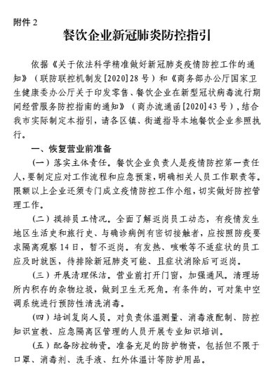 二、严格落实企业主体责任。恢复营业的企业要杜绝麻痹大意、轻慢松懈、盲目乐观,扎实做好疫情防控工作。要根据《餐饮企业新冠肺炎防控指引》(见附件2)的相关技术要求,认真做好各项防控措施,并制定突发事件应急处置方案,严格落实恢复营业前“责任机制建立到位、防控方案制定到位、员工信息排摸到位、联动防控机制到位、防控物资准备到位、安全生产保障到位”,以及恢复营业后“强化消费者安全管控、强化健康申报和晨检、强化科学佩戴防护用品、强化场所消毒、强化健康教育强化通风换气、强化交叉感染风险防控、强化饮食安全”等要求。