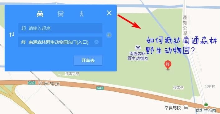 百度/高德地图搜索“南通森林野生动物园东门”。