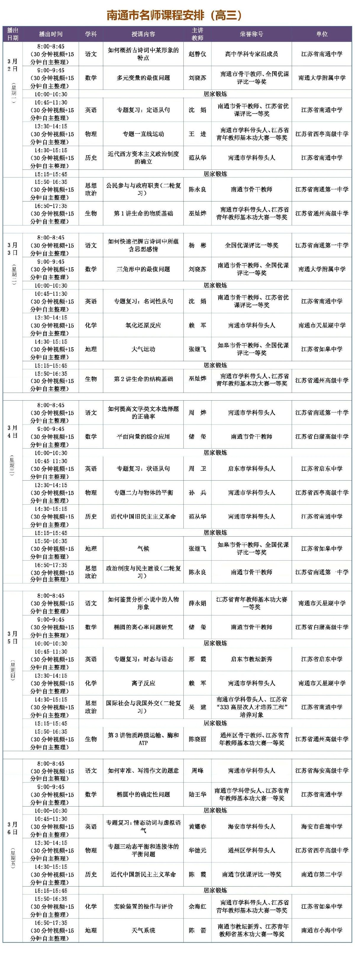 南通名师课堂高中第四期课程表一览