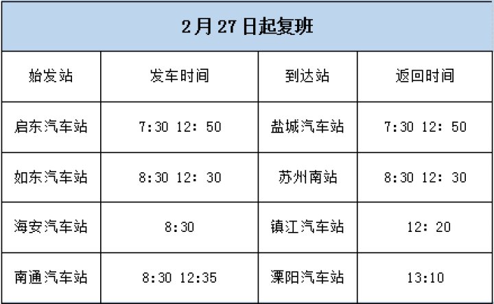 南通汽运集团2月27日、28日恢复的市际班线有哪些?