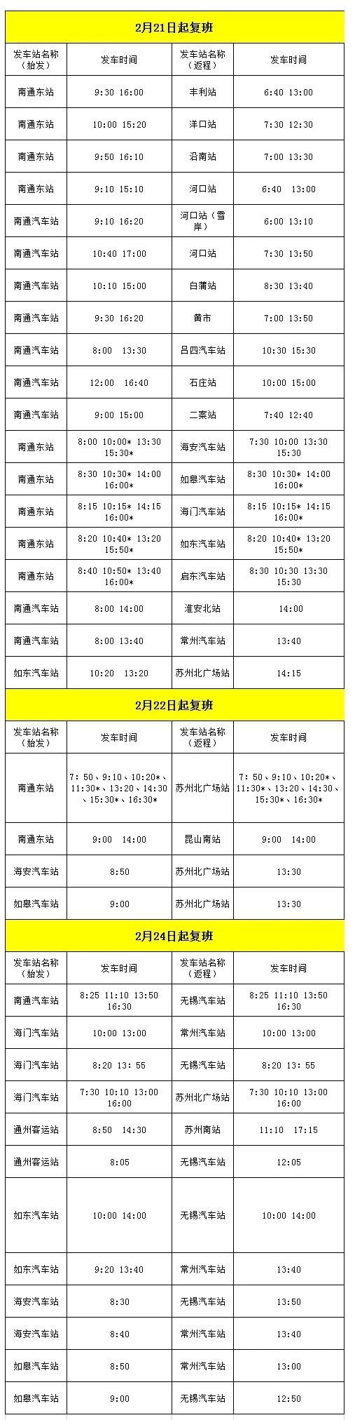 根据南通市新冠肺炎疫情防控指挥部交通防控组的通告精神,为全力助推企业复工复产,保障交通畅通,满足广大人民群众出行的需求,自2020年2月21日起,南通地区(各县、市、区)各汽车客运站全面恢复站务作业。