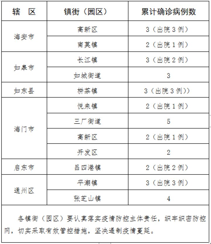 病例1:蔡某某,男性,31岁,现居如东县栟茶镇兴凌村26组,1月20日从武汉返通。(已出院)