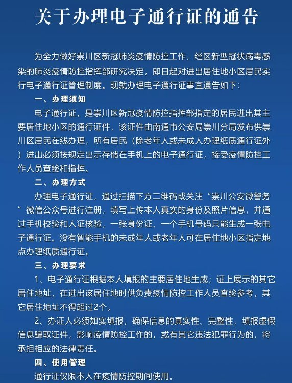 南通崇川区小区电子通行证办理通告 南通崇川区身份证办理