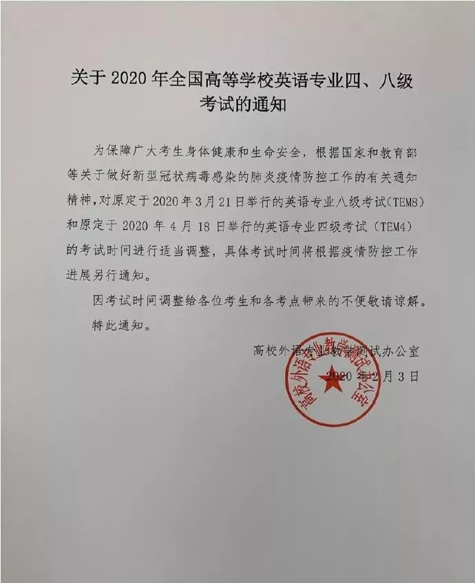 教育部对原定于3月21日举行的英语专业八级考试(TEM8)和原定于4月18日举行的英语专业四级考试(TEM4)的考试时间进行适当调整,具体考试时间将根据疫情防控工作的开展另行通知。