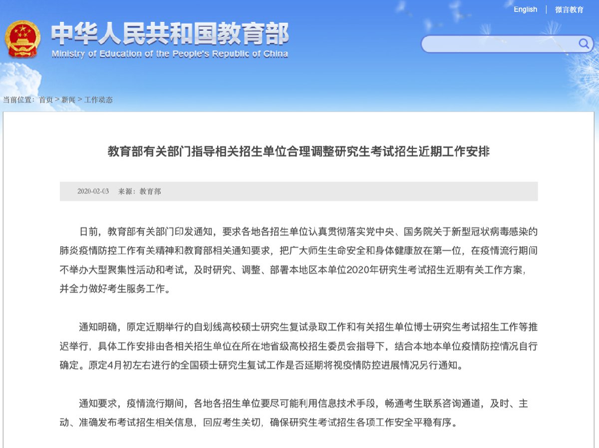 日前,教育部有关部门印发通知,要求各地各招生单位在疫情流行期间不举办大型聚集性活动和考试,及时研究、调整、部署本地区本单位2020年研究生考试招生近期有关工作方案,并全力做好考生服务工作。