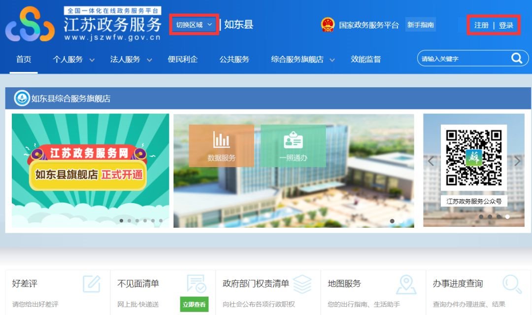 1.打开江苏政务服务网,选择“切换区域”,首次登录的用户点击注册,按照引导内容进行实名注册。