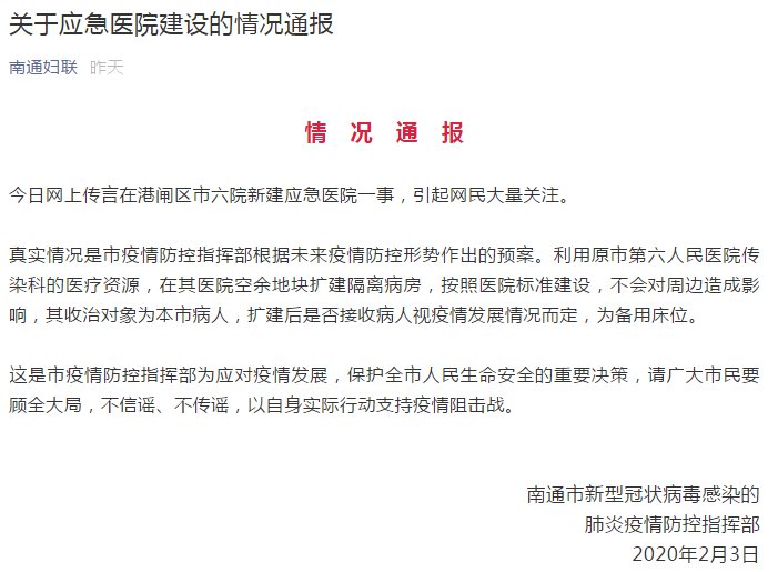 今日网上传言在港闸区市六院新建应急医院一事,引起网民大量关注。