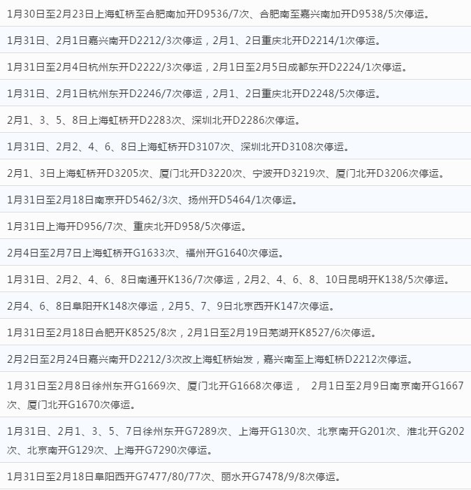 南通市列车停运信息一览