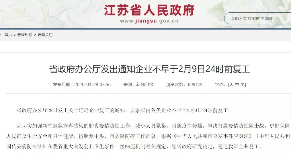 复工:江苏省内各类企业不早于2月9日24时前复工。