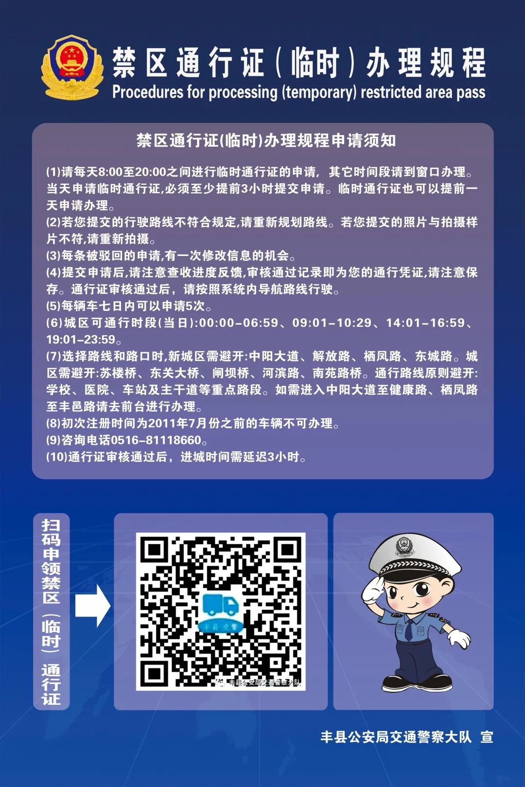 推出通行证手机APP,网上办理通行证业务,外地车辆可以提前联系目的地单位推送城区通行证APP。同时在进入丰县的公安检查站均有城区通行证APP二维码张贴,均可提前申请办理城区通行证,彻底解决通行证办理问题。