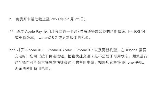 使用Apple Pay 快捷交通卡上下车刷卡或进出站刷卡时,建议尽量保证手机电量充足。另外,在装有最新版 iOS 且*兼容的 iPhone 上,当 iPhone 需要充电时,快捷交通卡可借助备用电量使用长达五个小时。在 iPhone 需要充电时,您可以按下侧边按钮,检查快捷交通卡是不是处于可用状态。频繁进行这个操作可能会大幅减少快捷交通卡的备用电量。如果您选择将 iPhone 关机,则无法使用备用电量。*兼容的iPhone iPhone SE(第 2 代)iPhone 11iPhone 11 ProiPhone 11 Pro MaxiPhone XRiPhone XSiPhone XS Max及更新机型。
