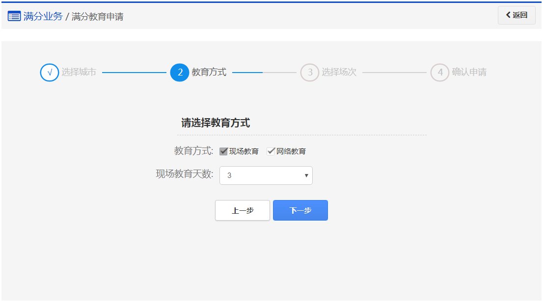 步骤2:【教育方式】在该步骤,用户选择教育方式,并确认现场教育天数(系统自动计算最少需要参加现场教育天数,选择天数不能少于该值)。选择"现场+网络教育"方式,请确保具备网络学习条件(电脑、摄像头、带宽)。 点击【下一步】,进入步骤3:【选择场次】。