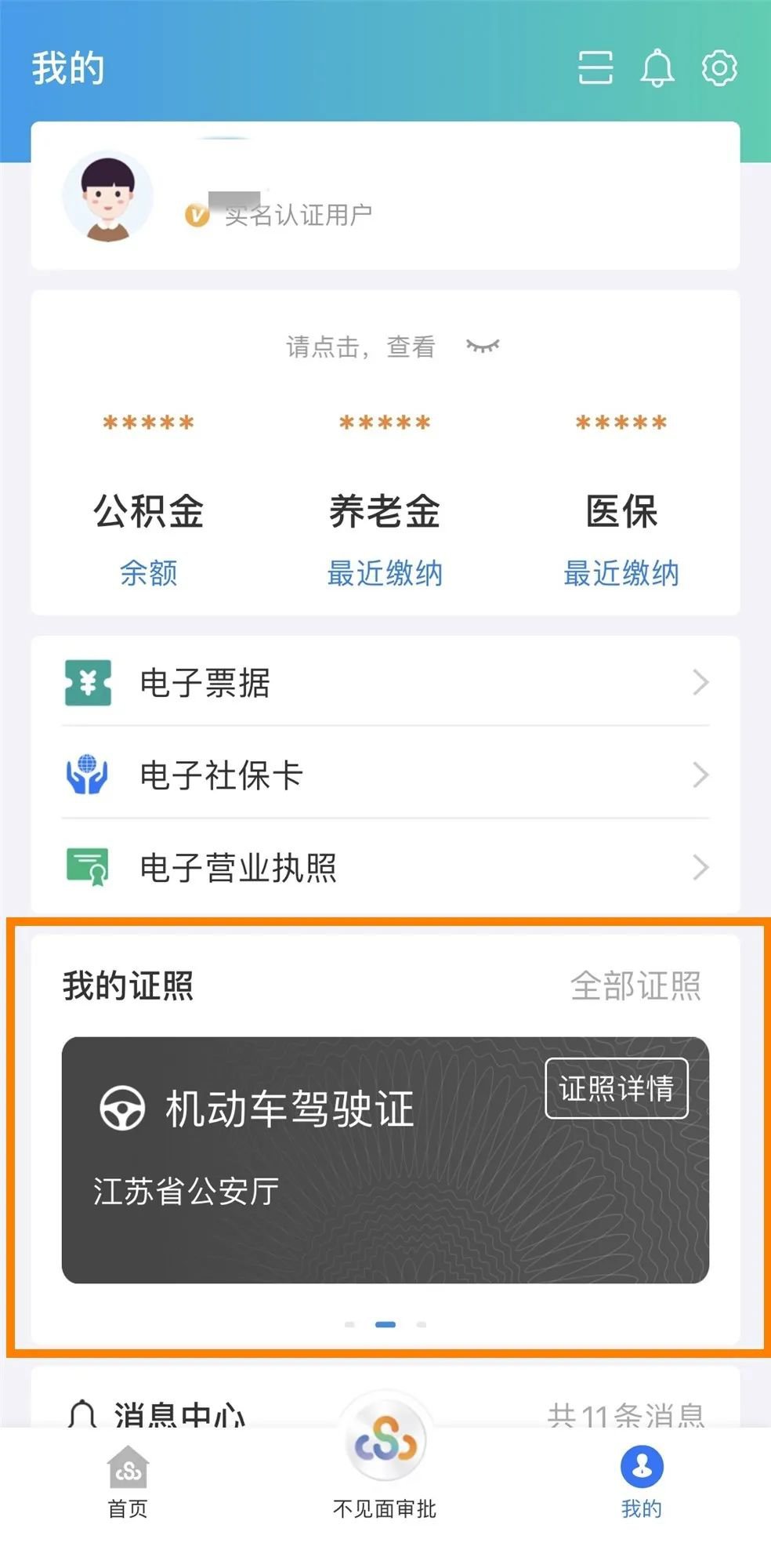 登录“江苏政务服务”APP,在“我的”页面选择“我的证照”。