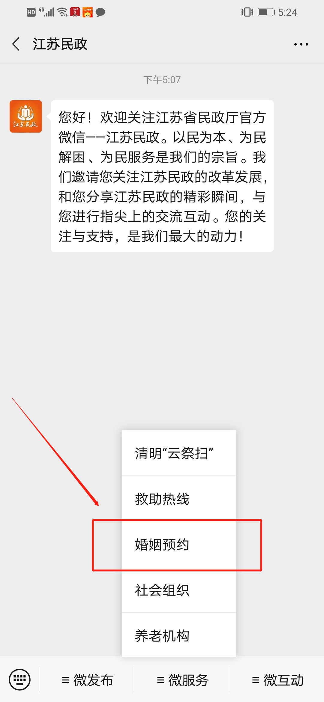 微信搜索“江苏民政”公众号,然后点击进入并关注,然后点击进入公众号,在公众号下方的菜单栏中点击“微服务”-“婚姻预约”,然后点击进入,选择预约事项,完善婚姻预约信息,然后点击“提交”即可申请