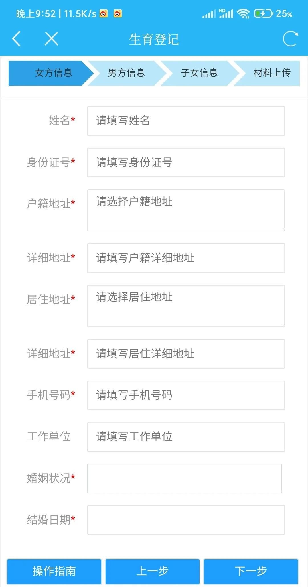 最后按照要求,填报夫妻双方及已生育子女信息,上传夫妻双方身份证、户口簿、结婚证原件照片或扫描件