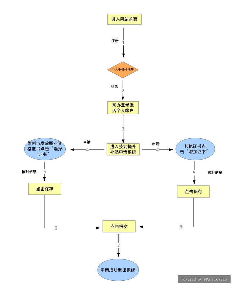 进入徐州公共就业服务网站首页→网上个人注册(手机号)→网办登录激活个人帐户→技能提升补贴申领→徐州市发放职业资格证书点击“选择证书”或其他证书点击“增加证书”输入证书信息保存并上传证书图片→点击保存→提交→申请完毕→可查看反馈审核公示发放结果