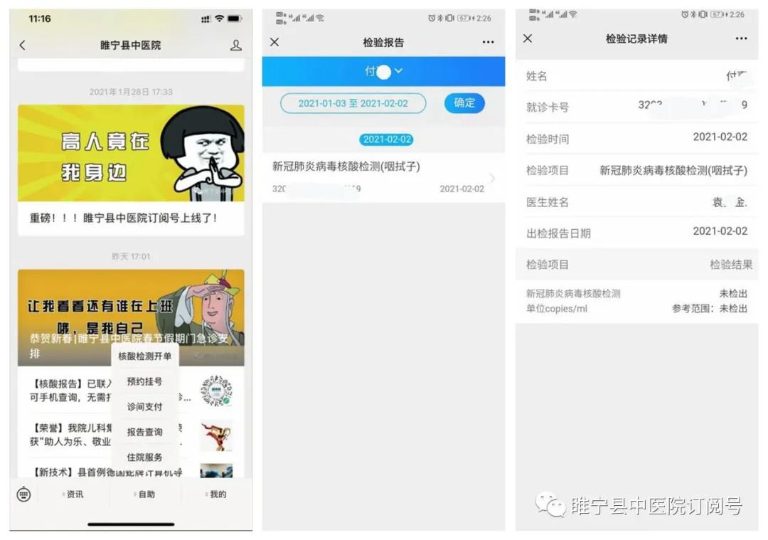 ①、睢宁县中医院公众号检验结果查看。点击“自助”→“报告查询”,点击“新冠肺炎病毒核酸检测”,可以查看具体检验记录详情。