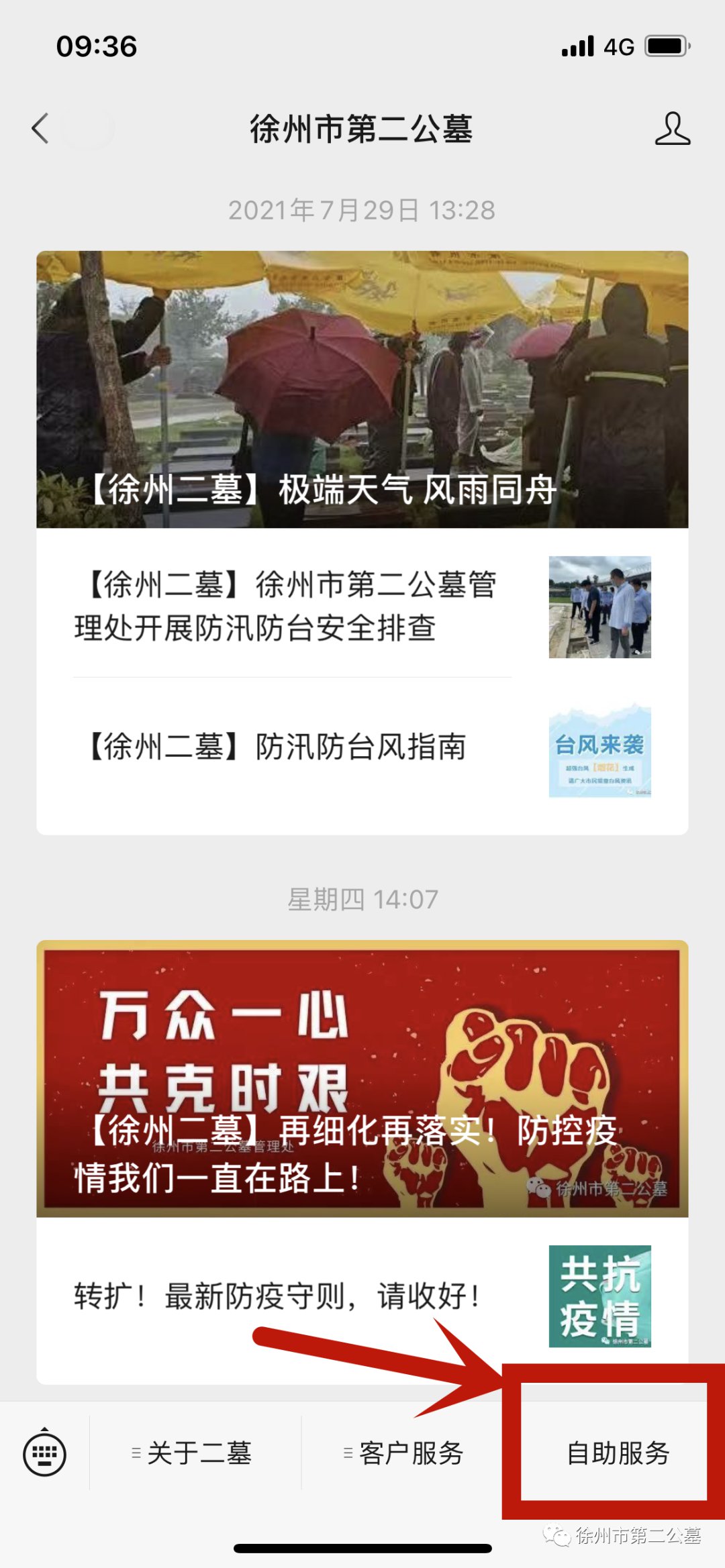 1、首先关注“徐州市第二公墓”微信公众号,进入公众号页面后点击“自助服务”。
