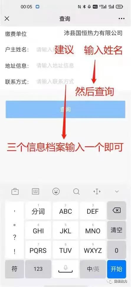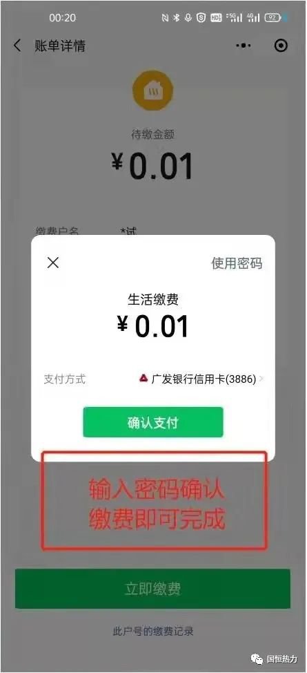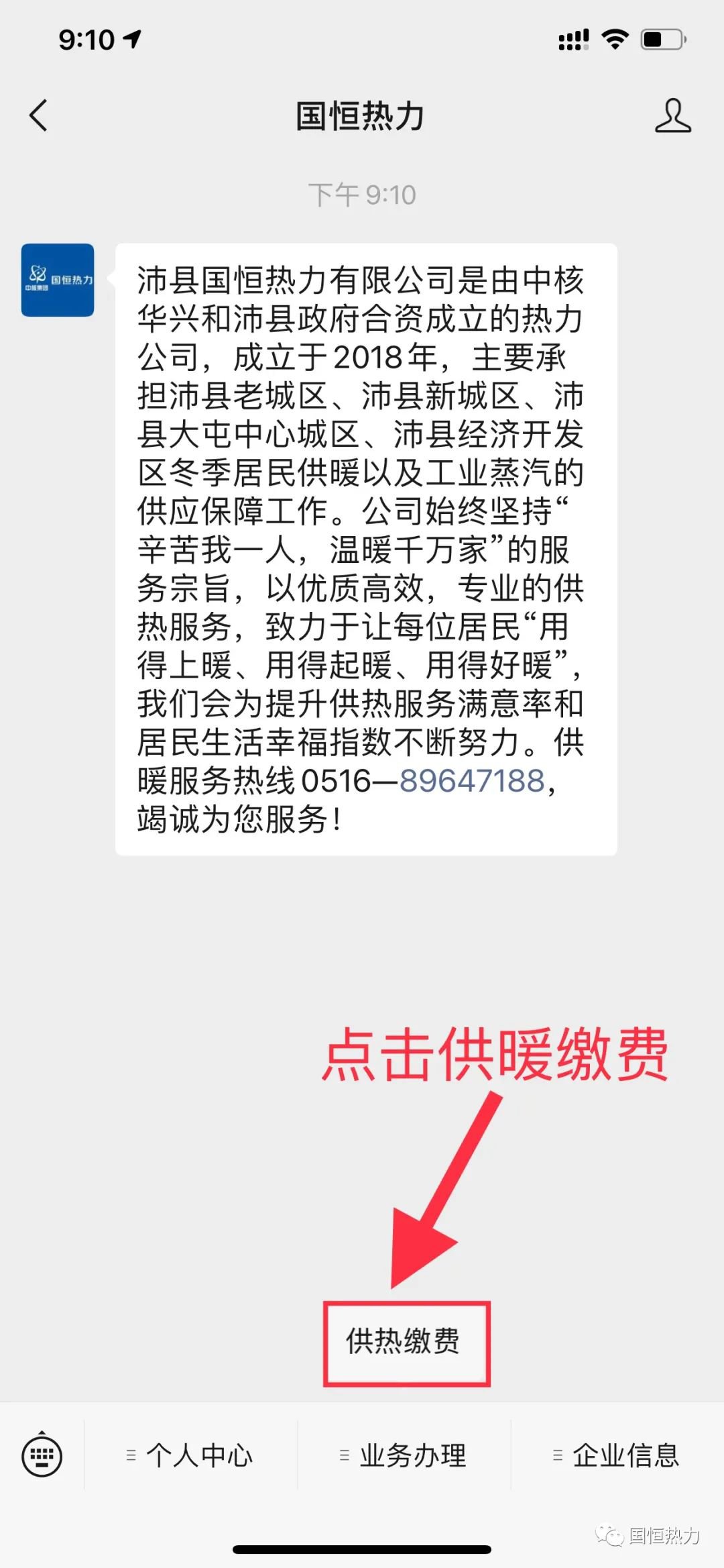 1、关注国恒热力微信公众号,即可进行缴费。(关注国恒热力微信公众号→业务办理→供暖收费→查询户号并绑定,该户号同时支持微信、支付宝生活缴费,核实信息无误后进行缴费。