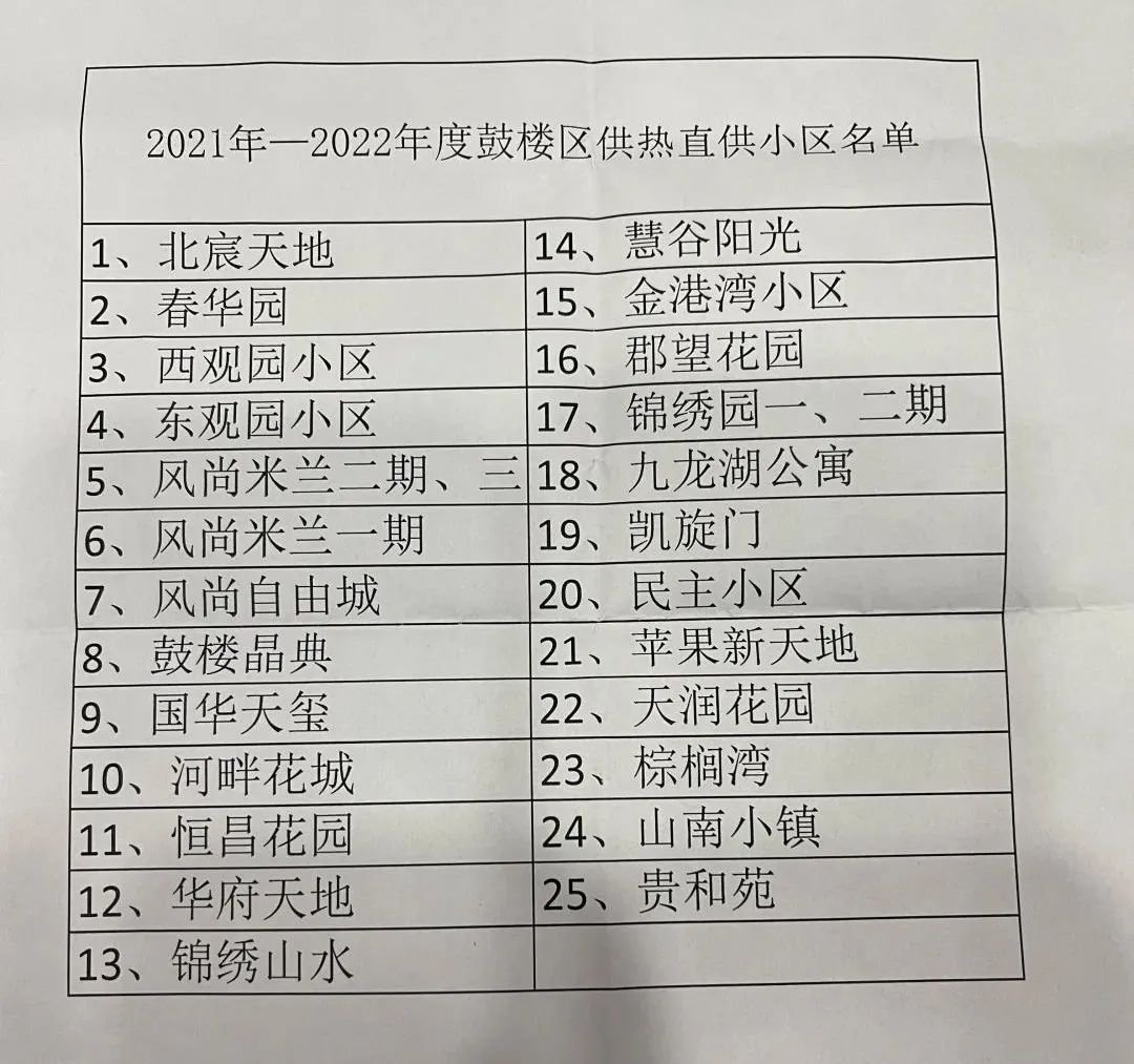 由鼓楼区房产服务中心提供直供暖的小区分别为:万科北宸天地、春华园、西观园小区、东观园小区、风尚米兰一/二/三期、风尚自由城、鼓楼晶典、国华天玺、河畔花城、恒昌花园、华府天地、锦绣山水、慧谷阳光、金港湾小区、郡望花园、锦绣园一/二期、九龙湖公寓、凯旋门、民主小区、苹果新天地、天润花园、棕榈湾、山南小镇、贵和苑。
