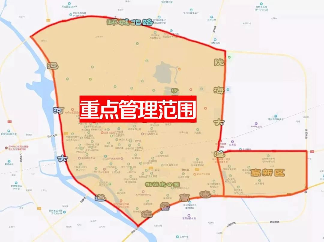 重点管理区范围:邳州市市区(南至运河大道、东南至连霍高速邳州城区段、东至陇海大道、北至环城北路、西至运河大道)、已建成的高新区区域、全市风景名胜区的核心区域。