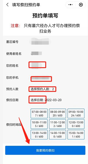 第六步:输入预约信息,填写经办人姓名、获取经办人在公墓预留的手机号,选择预约人数和预约时间段,点击“我要预约祭扫”